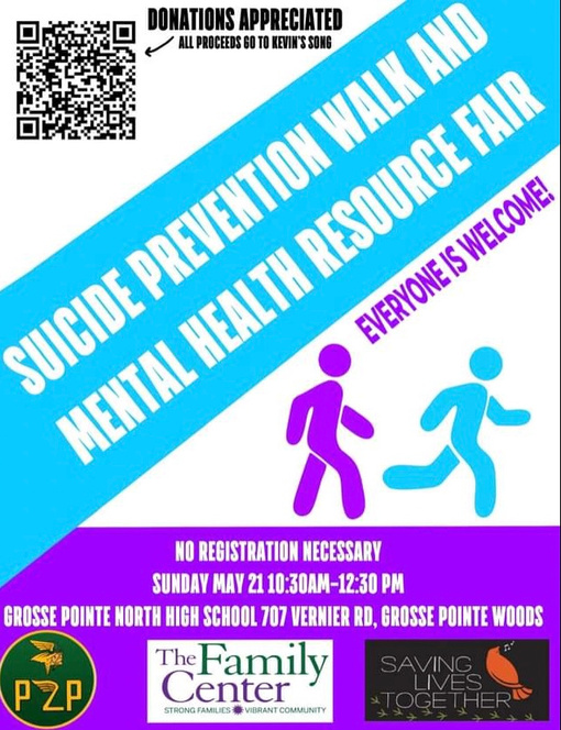 Grosse Pointe North High School is hosting the Annual Suicide Prevention Walk & Mental Health Fair on Sunday, May 21 from 10:30 am - 12:30 pm.